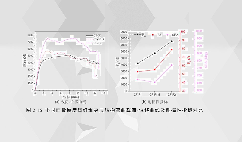 圖2.16(a)比較了不同面板厚度碳纖維夾層結(jié)構(gòu)的載荷-位移曲線,可以發(fā)現(xiàn),CF-F1的載荷-位移曲線屬于曲線類型Ⅲ,而其臨界失效模式為壓痕壓入(IN);由于碳纖維在拉伸過程沒有明顯的塑性變形,當其開始失效時,后續(xù)載荷的變化趨勢與臨界載荷為IN的鋁合金夾層結(jié)構(gòu)有一定的差異,CF-F1開始失效時,載荷并沒有下降,只是增加的幅度大大地減少。CF-F1.5和CF-F2的臨界失效模式為芯層剪切失效(CS),二者達到臨界載荷之后載荷有所降低,兩者的載荷-位移曲線屬于類型IV。與CF-F2不同的是,CF-F1和CF-F1.5其后期壓潰力的大小變化趨勢相對平緩。試件整體斷裂前(14-16mm處)的變形模式主要存在芯層泡沫壓縮、剪切裂紋和界面失效,隨著位移的增加,面板纖維發(fā)生斷裂,試件失去承載能力。