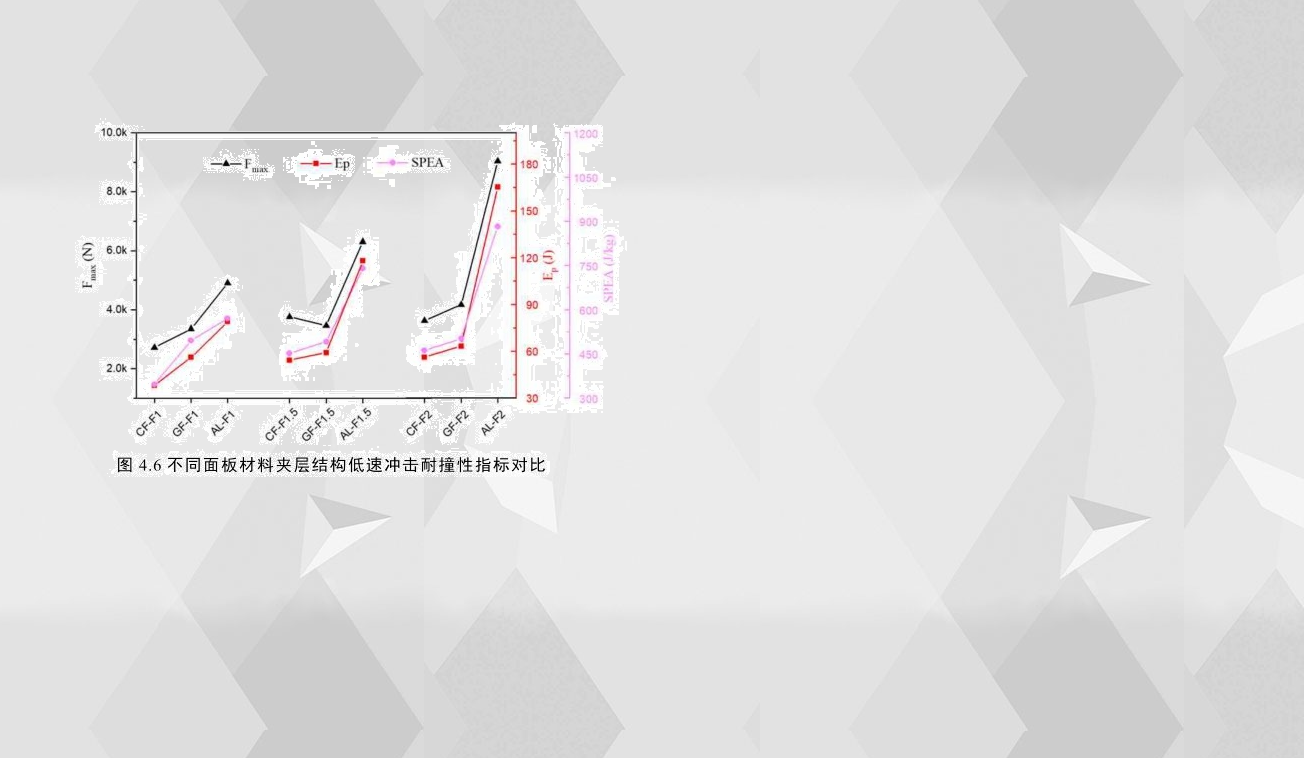 為了更為直觀地比較不同面板材料的夾層結(jié)構(gòu)的抗沖擊性能,圖4.6比較了相同面板厚度但面板材料不同的夾層結(jié)構(gòu)的耐撞性指標(biāo),通過比較可以看出,鋁合金夾層結(jié)構(gòu)有最優(yōu)的耐撞性能,其臨界穿透能高達(dá)118J,初始峰值載荷高達(dá)6297N;而碳纖維增強(qiáng)夾層結(jié)構(gòu)的耐沖擊性能明顯低于鋁合金夾層結(jié)構(gòu)的,其臨界穿透能和初始峰值載荷分別為54J和3752N;而與碳纖維增強(qiáng)夾層結(jié)構(gòu)相比,玻璃纖維的耐碰撞性略有提高,其臨界穿透能為59J。此外,根據(jù)三者完全穿透試件的載荷-位移在第一階段的斜率可以看出,如圖4.5(d),鋁合金夾層結(jié)構(gòu)的斜率最大,也就是說,在低速沖擊工況下,鋁合金夾層結(jié)構(gòu)的剛度大于纖維增強(qiáng)夾層結(jié)構(gòu)的剛度。通過觀察面板厚度為1mm和2mm試件的耐撞性指標(biāo),也可以知道,在低速沖擊工況下,鋁合金夾層結(jié)構(gòu)有最好的耐撞性能,而碳纖維夾層結(jié)構(gòu)的耐撞性能在三者幾乎是最差的。